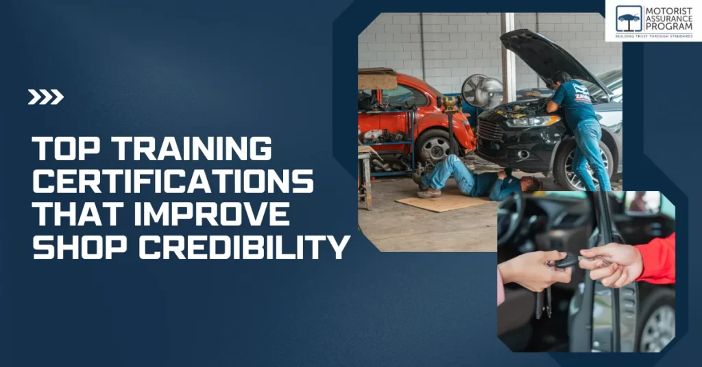 To improve your shop’s credibility, focus on obtaining top certifications like ASE (Automotive Service Excellence), I-CAR for collision repair, and OEM-specific certifications for brand expertise. These certifications demonstrate