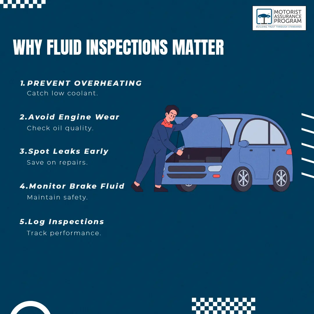 Regular fluid inspections help prevent breakdowns by catching problems early before they turn into major repairs. When fluids like oil or coolant become too low or contaminated, your car can overheat or the engine can wear out more quickly. Checking your fluids regularly helps keep everything running smoothly, extends your car’s lifespan, and saves you money in the long run.